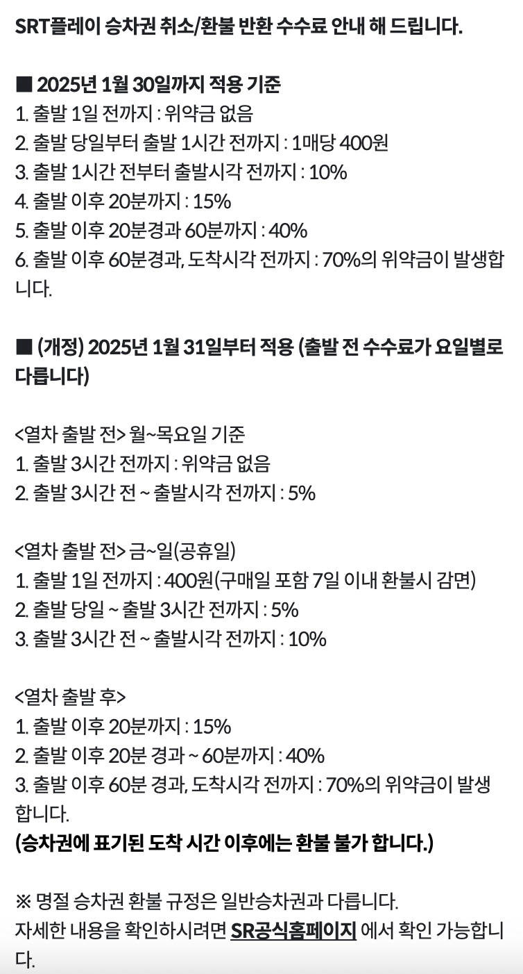 SRT플레이 승차권 취소는 월~목요일 기준 출발 3시간 전까지 위약금이 없고, 주말 및 공휴일에는 출발 1일 전까지 수수료가 400원이니